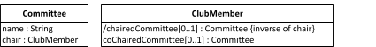 For being able to easily retrieve the committees that are chaired or co-chaired by a club member, we add two reference properties to our Committee-ClubMember example model: the property of a club member to be the chair of a committee (ClubMember::chairedCommittee) and the property of a club member to be the co-chair of a committee (ClubMember::coChairedCommittee). We assume that any club member may chair or co-chair at most one committee (where the disjunction is non-exclusive). So, we get the following model: