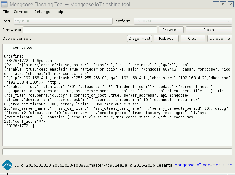 As a simple test, lets check the current configuration of your ESP module, currently running on the Mongoose-IoT firmware. For this, in the MFT Console, write Sys.conf then press Enter. As result, the serialized JavaScript configuration object is shown (see Figure 10).